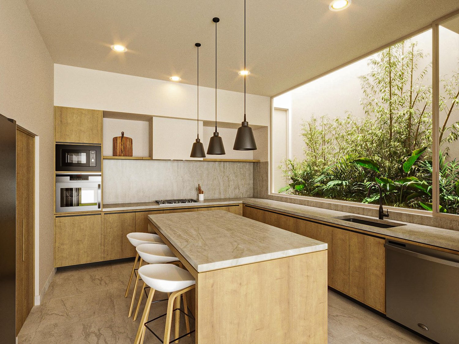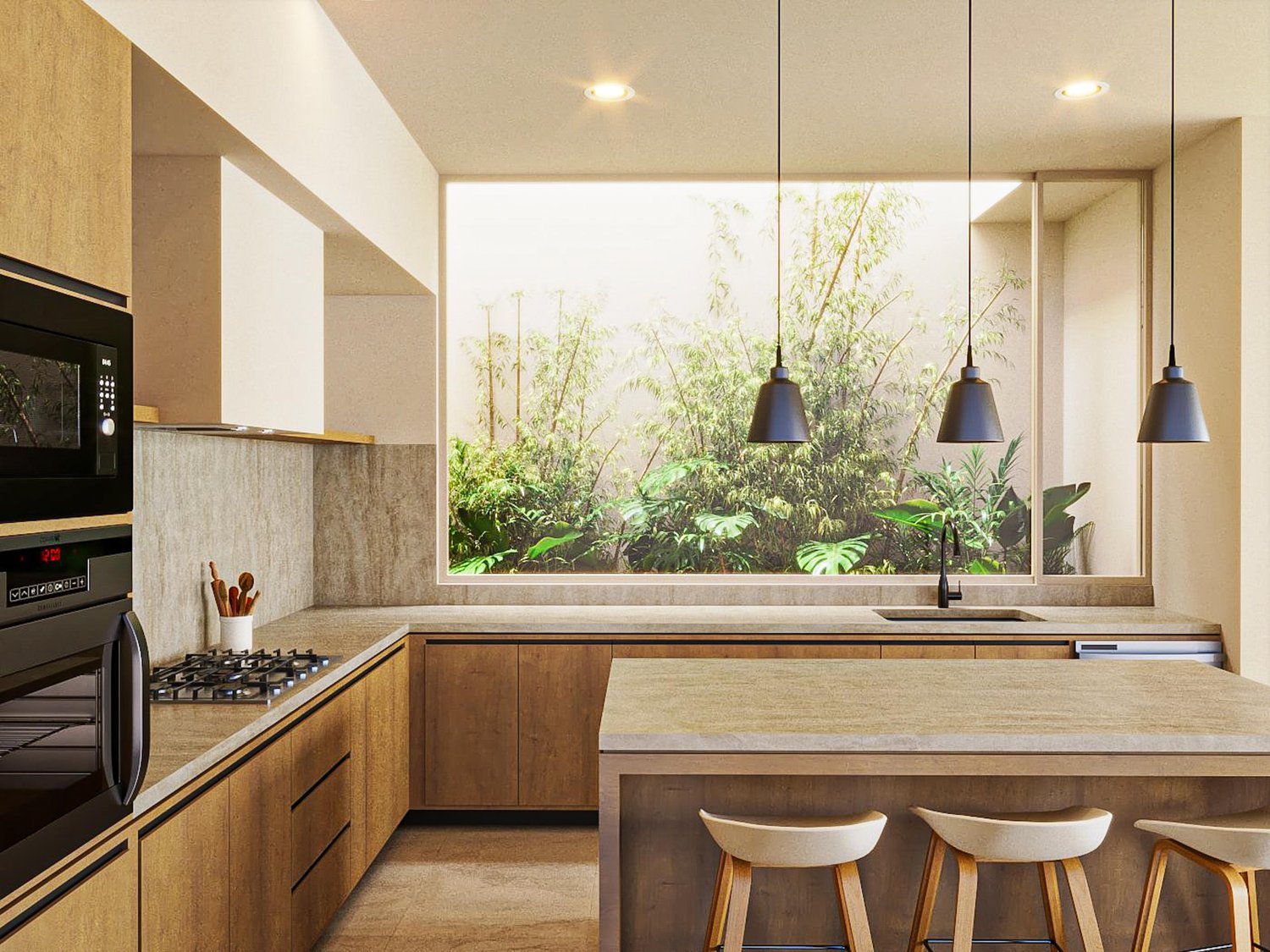 La planta baja propone un recorrido fluido y funcional. Una cochera techada para dos autos recibe con discreción. Al ingresar, la sala, el comedor y la cocina se integran en un mismo eje visual, pensados como el corazón social de la casa. La cocina equipada —protagonista por su limpieza formal y espacio— se abre hacia un jardín que permite que el exterior se vuelva parte de la vida cotidiana.