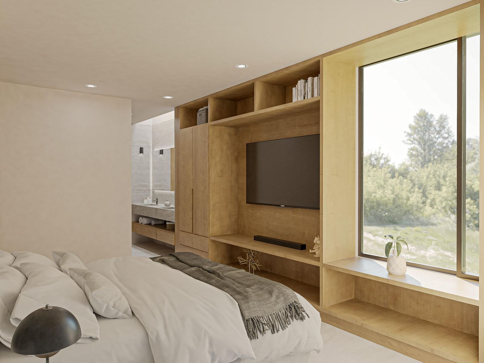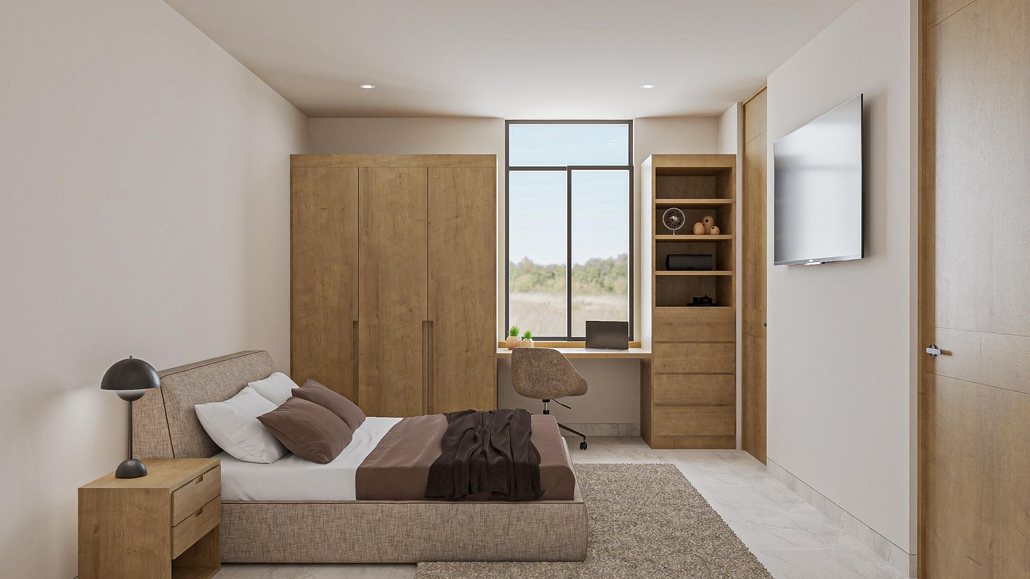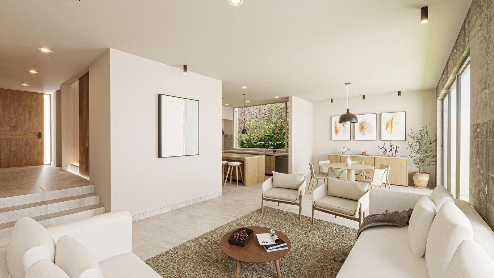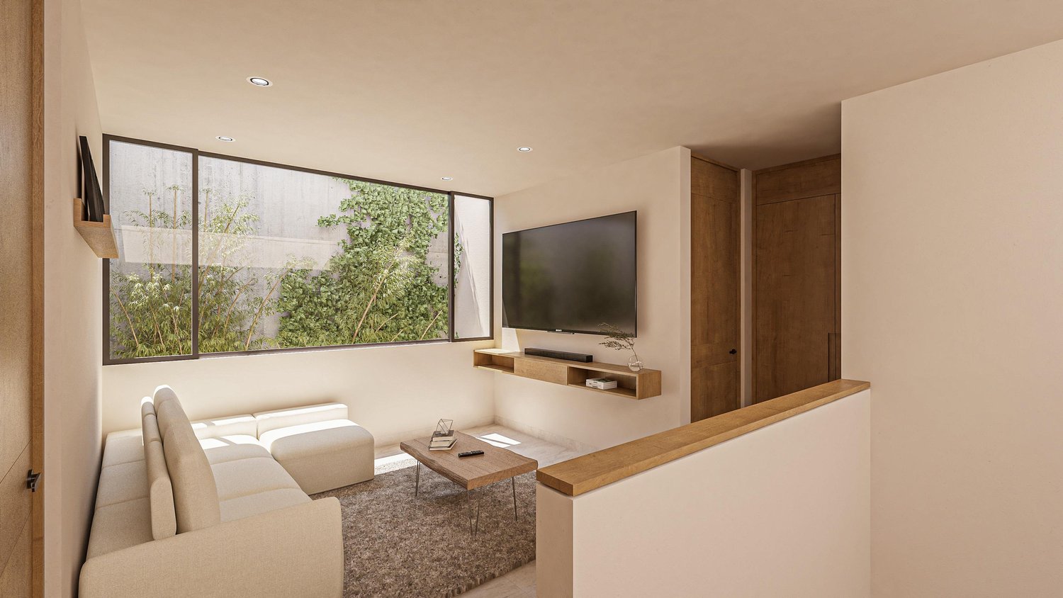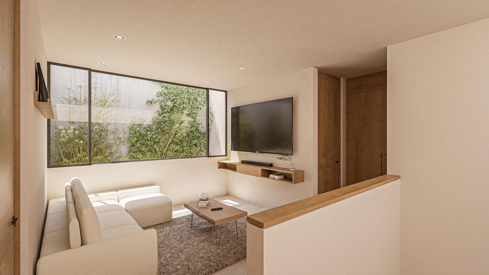 En la planta alta, la habitación principal ocupa una posición estratégica: cuenta con un amplio vestidor y baño privado, lo que la convierte en un refugio íntimo y bien iluminado. Las dos recámaras secundarias, ambas con baño propio, están pensadas para brindar autonomía y comodidad. El diseño culmina con un family room central, que funge como espacio de encuentro, descanso o trabajo desde casa.