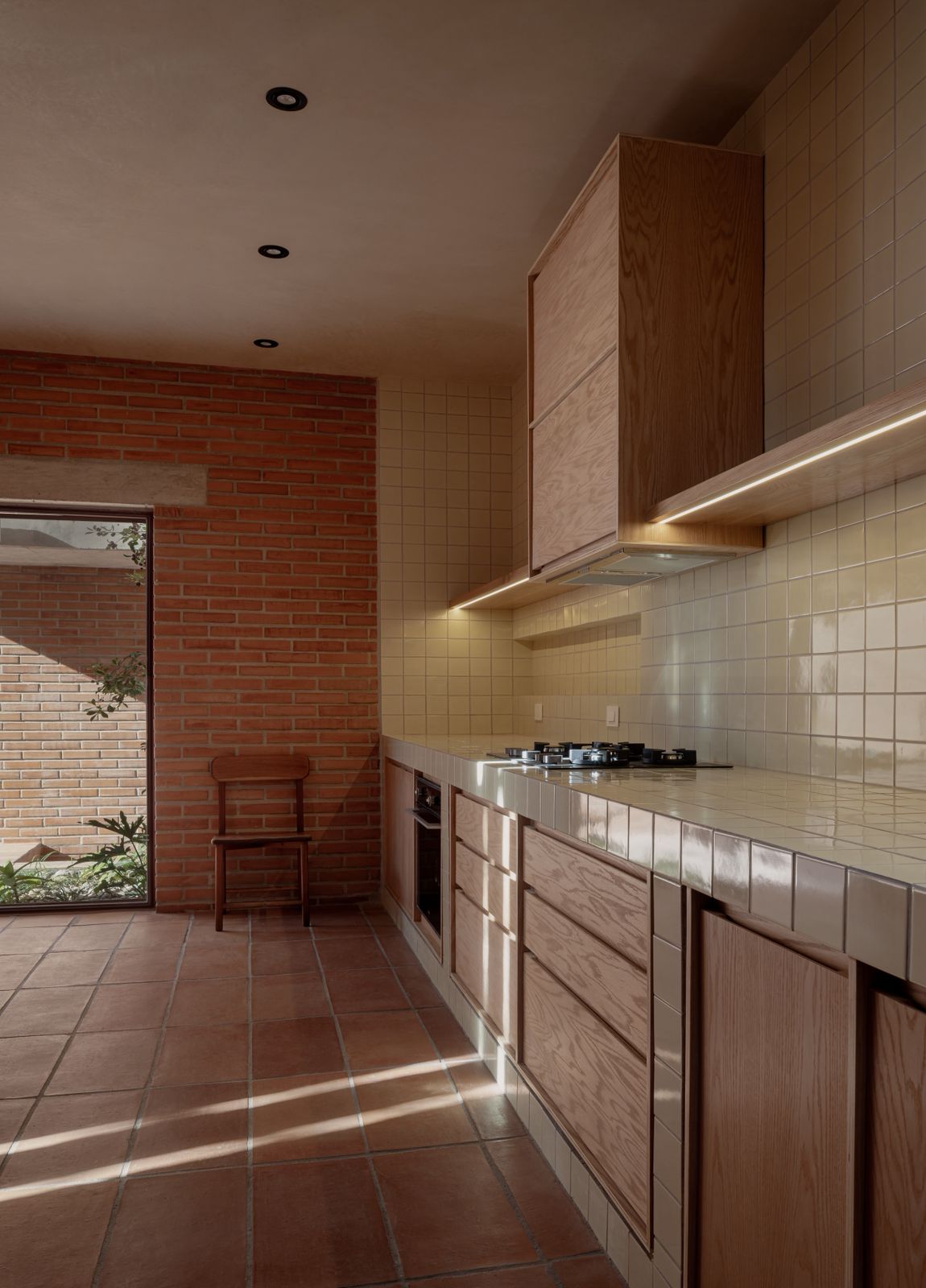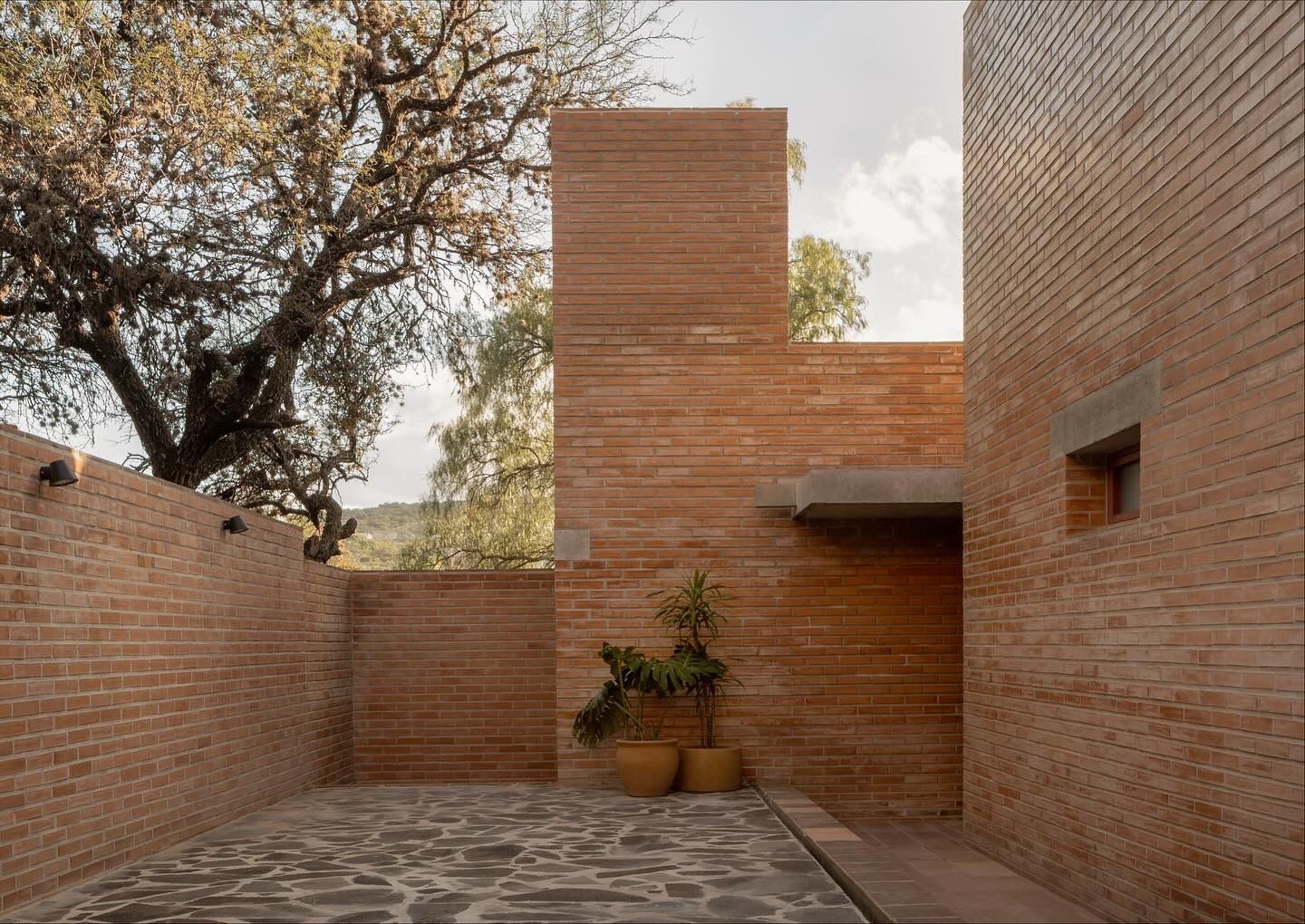 El ladrillo del Bajío actúa como estructura, piel y clima: muros gruesos que protegen del sol y del ruido, una textura que envejece bien y una paleta sobria que se combina con madera y herrería para que la vida de quien habita sea la que ponga el color.